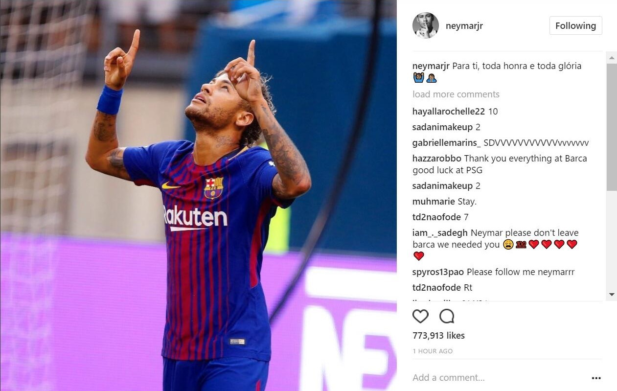 在《马卡报》发表“内马尔将和巴黎圣日耳曼签约6年,税后年薪达3000万欧元”的消息之后,内马尔通过Instagram发表了一张图片。