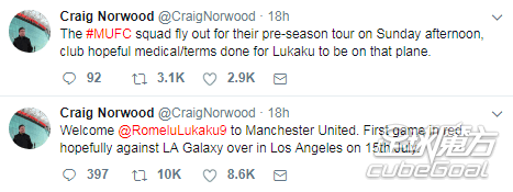 诺伍德在推特上写道:“欢迎卢卡库加盟曼联。他身披红魔球衣的第一场比赛大概是7月15日在洛杉矶对阵洛杉矶银河的比赛。”