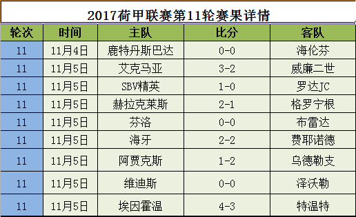【荷甲联赛第11轮赛果详情】