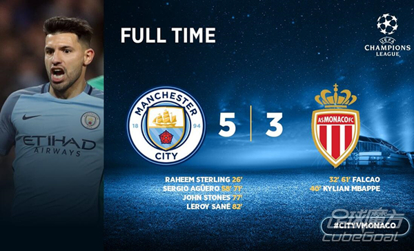 阿圭罗在与摩纳哥一战中梅开二度帮助球队两次扳平比分,并最终5-3逆转获胜。本场比赛过后阿圭罗已经各项赛事打进20球,成为曼城队史首位连续5个赛季进球数超20的球员,他在比赛中打进的第一球也是曼城队史欧战第200球。