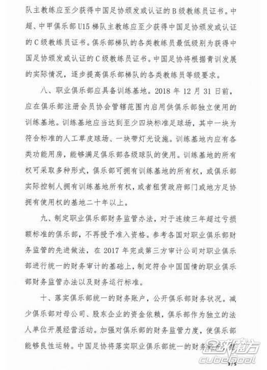 本次通知的主要内容除了包括此前已经下发的通知中包含的外援登场人数限为3人,以及U23国内球员首发出场的政策之外,还包括禁止俱乐部以现金形式发放薪酬、对欠薪俱乐部取消**资格、落实俱乐部统一财政账户以及中超俱乐部需建设U15,U17,U19**梯队等内容。