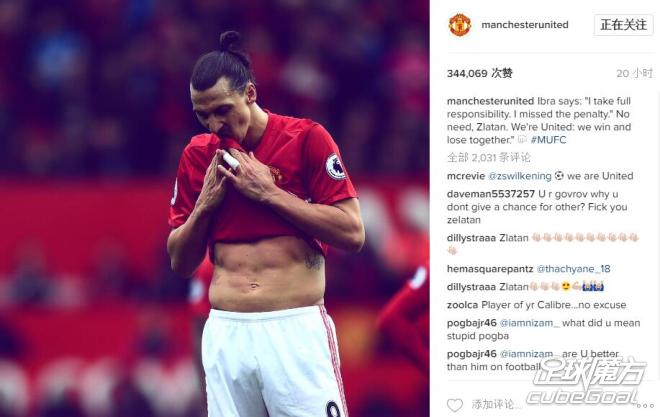 对此,曼联官方INS晒图并且写到:伊布说‘我承担所有的责任,我罚丢了点球’。不需要,兹拉坦。我们是曼联:无论输赢,一起承担。