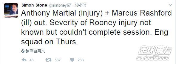 在球队前往伦敦的名单中,球队前场数人缺席,其中,伊布由于英足总的三场禁赛,将无缘本场比赛,而鲁尼、马夏尔、拉什福德三人也未出现在本场名单中,据BBC记者西蒙-斯通透露,马夏尔和鲁尼因受伤无缘出战本场比赛,而拉什福德则因病缺席比赛。
