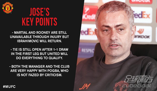 在这次主场比赛到来之前,曼联取得了一个宝贵的客场进球,红魔希望在主场锁定晋级机会。穆里尼奥透露,马夏尔和鲁尼将继续缺阵,和足总杯比赛相比,只多了兹拉坦-伊布拉希莫维奇可供选择。