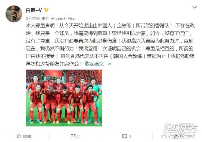 白鹤个人声明如下:本人郑重声明!从今天开始退出由韩国人(金教练)所带领的香港队! 不存在政治,我只是一个球员,我需要得到尊重!