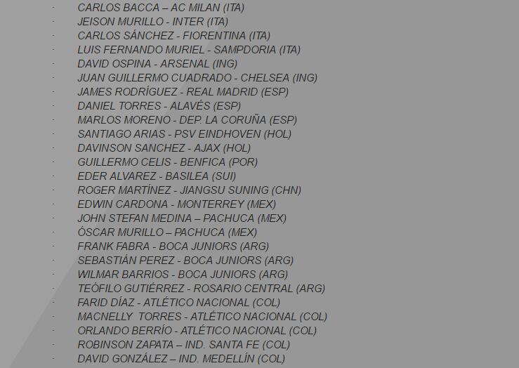中场:卡洛斯-桑切斯(佛罗伦萨),J罗(皇家马德里),丹尼尔-托雷斯(阿拉维斯),卡尔多纳(蒙特瑞),维尔马-巴里奥斯(博卡青年),麦克内利-托雷斯(国民竞技),乌里韦(国民竞技),阿吉拉尔(卡利体育)