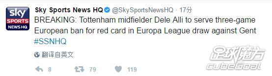 热刺在欧联杯上被根特淘汰,阿里在比赛中因恶意蹬踏犯规被红牌直接罚下,间接导致球队无缘欧联16强,现在他也受到了3场欧战禁赛的处罚。
