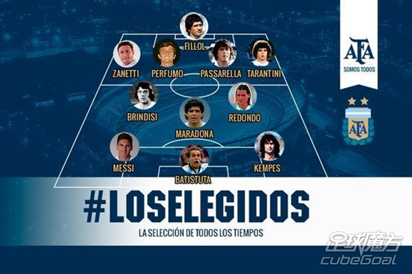 阿根廷官方评选了历史最佳阵容,梅西是唯一入选的现役球员,而名单上还有马拉多纳、巴蒂斯图塔、萨内蒂等一系列传奇球星。