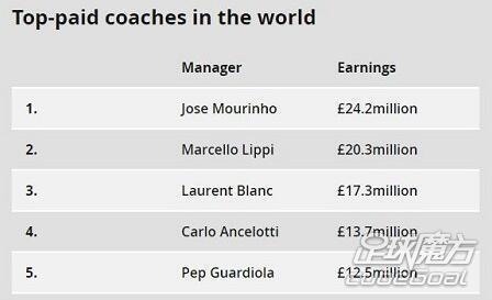 中国国家队主教练里皮以2030万英镑的收入排在第二,而前任巴黎圣日耳曼主帅法国人布兰科以1730万英镑排在第三,大巴黎方面目前仍需为其支付两年的薪水。曼城主帅瓜迪奥拉以1250万英镑排在榜单的第五位。