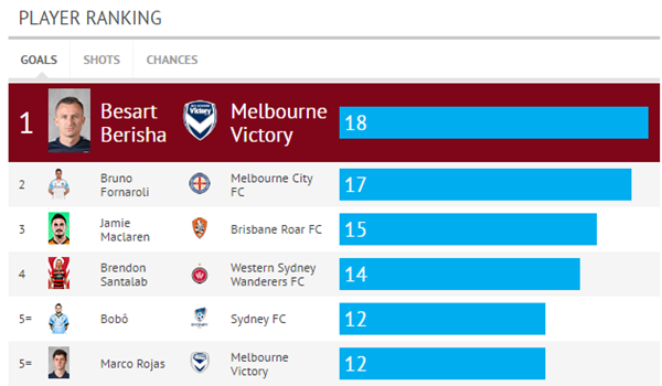 随着澳超常规赛即将收尾,金靴的争夺也来到了白热化阶段。还有三轮的情况下,常规赛金靴将基本在墨尔本胜利的贝里沙、墨尔本城的弗尔纳罗利、布里斯班狮吼的麦克拉伦以及西悉尼漫步者的老将桑塔拉布这四位射手中产生了。