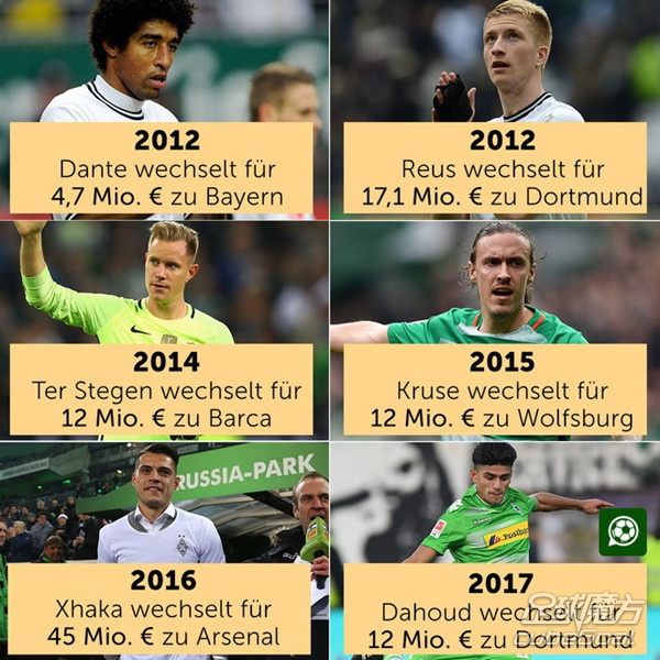 2015年门兴当时的德国国脚前锋克鲁泽以1200万欧元加盟沃尔夫斯堡;2016年夏天门兴队长扎卡以4500万欧元的高价加盟阿森纳;而今年多特蒙德花费解约金签下了门兴的中场希望之星达胡德。