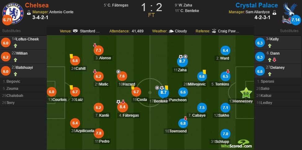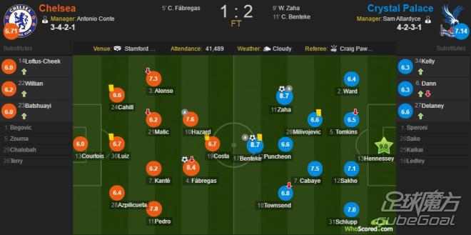 最终,切尔西在主场先由法布雷加斯攻入一球的情况下,水晶宫在比赛的第9分钟和第11分钟分别由扎哈和本特克攻入进球,实现迅速反超,并将2-1的比分保持到了终场。