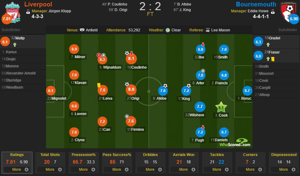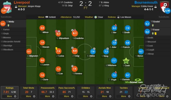 北京时间4月6日凌晨3点整,2016-17赛季英超联赛第31轮,利物浦主场迎战伯恩茅斯。最终,双方在安菲尔德2-2握手言和。在whoscored的赛后评分,打入扳平球的库蒂尼奥和伯恩茅斯后卫库克获得了全场最高的8.1分。
