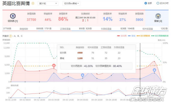 英超第31轮战罢,除曼联利物浦收获平局、斯旺西不敌热刺以外,其余主队均主场告捷,包括切尔西2-1力克曼城的英超焦点战。赛前,全球最大的赛前决策服务平台——基于独家情绪分析引擎对4000+新闻媒体报道大数据分析发现,切尔西舆情胜率(均值86%)全程跑赢即时胜率(均值44%),为双杀瓜迪奥拉的“蓝月亮”埋下重要伏笔。此外,阿森纳舆情指数未能突破一万大关,仅排英超第八,在主场闷声完成反弹。