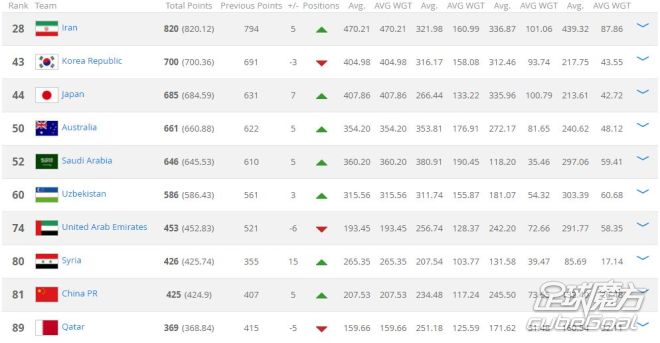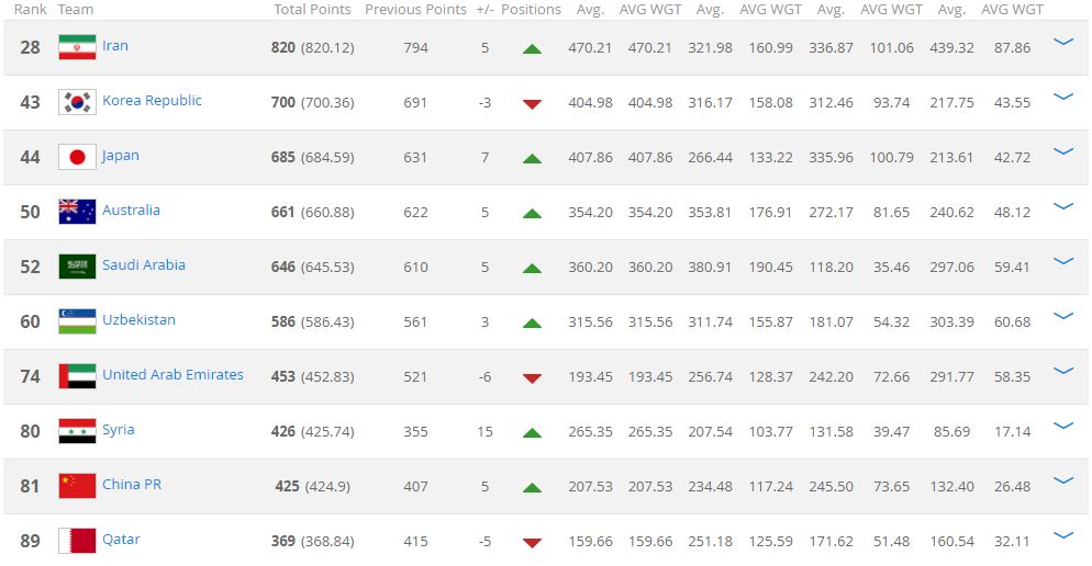亚洲前十如下:伊朗(28位)、韩国(43位)、日本(44位)、澳大利亚(50位)、沙特(52位)、乌兹别克斯坦(60位)、阿联酋(74位)、叙利亚(80位)、中国(81位)、卡塔尔(89位)。