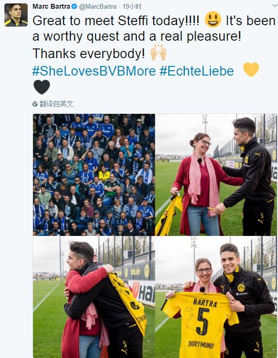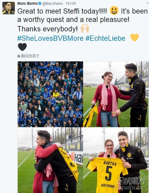 多特球员巴尔特拉赛后的得知,便通过推特发布信息,希望找到这位可爱的球队真爱粉,并称要将自己的球衣送给她。