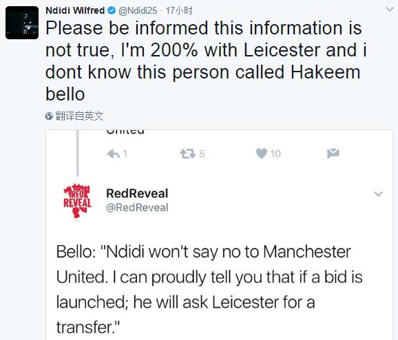 日前,据恩迪迪的祖国尼日利亚媒体报道,一名据称是恩迪迪经纪人的人表示,如果穆里尼奥召唤,自己的客户对转会曼联持开放态度。但在英国媒体报道了同样的事情之后,恩迪迪称自己并不认识这位所谓的经纪人,而且向莱斯特城表示了忠心。