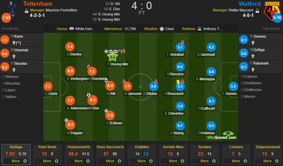 洛里7.3、本戴维斯7.4、维尔通亨8.0、阿尔德韦雷尔德7.7、特里皮尔8.5、登贝莱7.2、戴尔8.5、孙兴慜9.2、阿里8.4、埃里克森7.9、扬森7.1(凯恩7.3、奥诺玛6.0、西索科6.2)