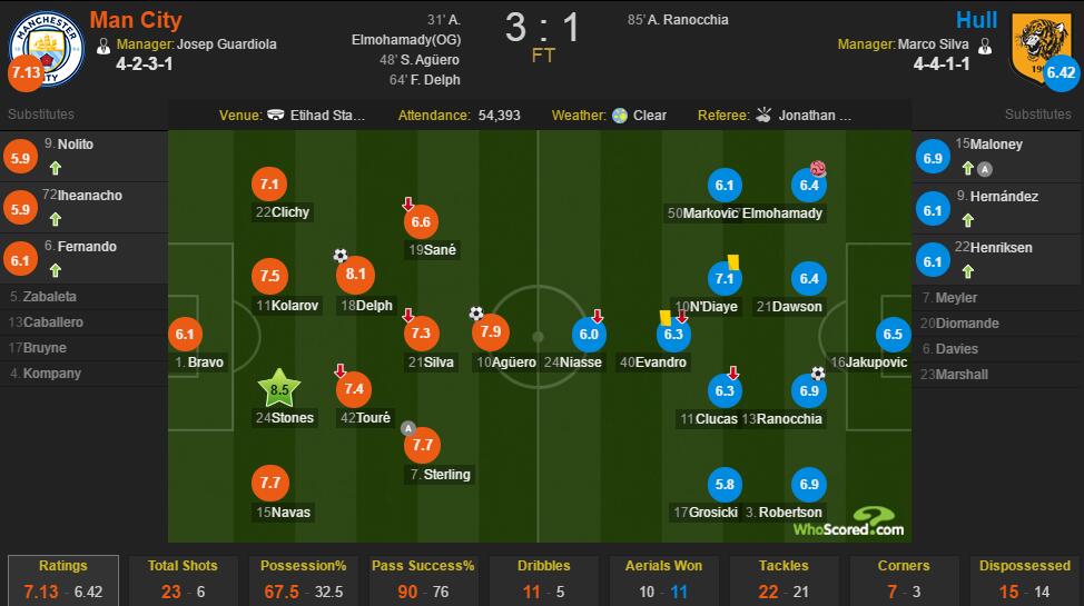 布拉沃6.1分、克里希7.1分、科拉罗夫7.5分、斯通斯8.5分,纳瓦斯7.7分、德尔夫8.1分、萨内6.6分、席尔瓦7.3分、亚亚-图雷7.4分、斯特林7.7分、阿圭罗7.9分。替补:诺利托5.9分、伊希纳乔5.9分、费尔南多6.1分。