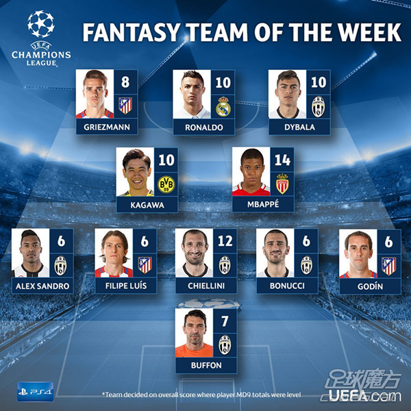 欧足联官方公布了本周欧冠最佳阵容,尤文图斯和马竞分别有五名和三名球员入选,其他三人为C罗、香川真司和姆巴佩。