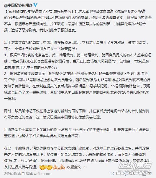 中国足协新闻办的官博写道:针对天津电视台体育频道《体坛新视野》报道的“预备队裁判醉酒执法并错认不在场球员犯规”的新闻,经协会多方调查核实,该报道内容完全不实,报道带有严重倾向性、片面取证,恶意中伤正常执法的裁判员,并经其他媒体转载传播,造成了恶劣影响。我们对此表示强烈谴责。