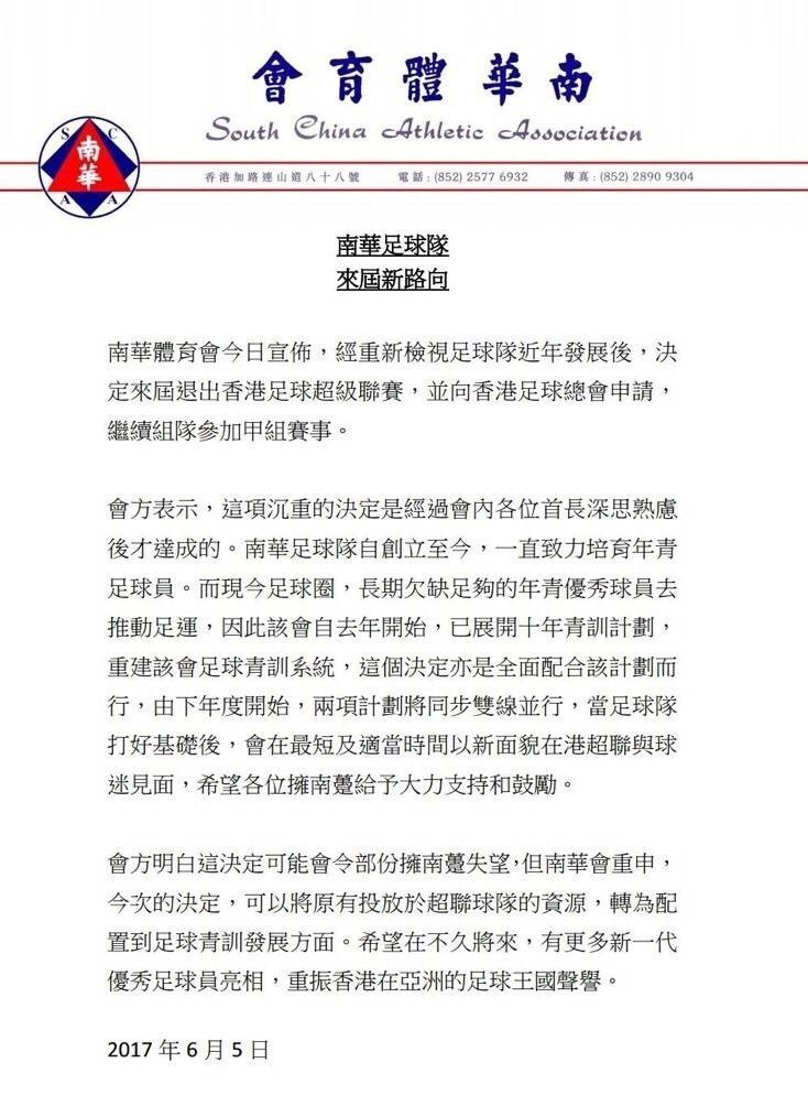 官方消息,香港百年俱乐部南华足球会正式向香港足球总会提出退出港超联赛的申请。南华足球会的投资人张广勇先生此前已经宣布下赛季不再资助南华,目前南华仍然没有找到新的投资方。