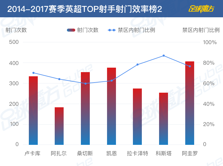 值得一提的是,拉卡泽特射门次数中规中矩,但他禁区**门比例高达78.5%,仅次于迭戈·科斯塔的85.1%,甚至高于阿圭罗的76.4%,这说明拉卡泽特的突进能力出色,是位极具威胁的禁区杀手。