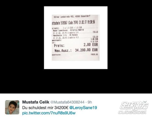 在曼城与摩纳哥的比赛之后,有位名叫Mustafa Celik网友将一张投注单发上了社交平台,并@萨内称其欠自己3.4万欧元。他在此次的投注中压中了药厂2-4马竞的比分,他还预测曼城4-3战胜摩纳哥。正是萨内的第5个进球让他的投注没能获得大奖,而萨内在赛后也回应了这名网友,并表示自己为他的运气而遗憾。