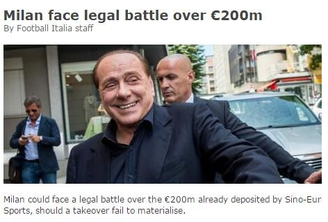 《罗马体育报》表示,中欧体育最终如果收购米兰失败的话,他们将通过法律途径要回2亿欧元定金。中欧体育认为,如果交易失败,是由于中国政府对于巨额资金外流的严格管控所导致,问题并不在于己方,所以己方理应要回2亿欧元定金。