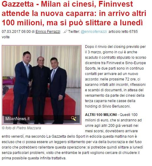 各大意媒在昨日均称,费宁韦斯特集团和中欧体育此前签署的排他性协议已经到期了,费宁韦斯特集团有权叫停交易,不过他们决定再给中欧体育一次机会,贝卢斯科尼愿意将交易日期推迟到3月31日,不过中欧体育需要在3月10日之前再次支付1亿欧元定金。