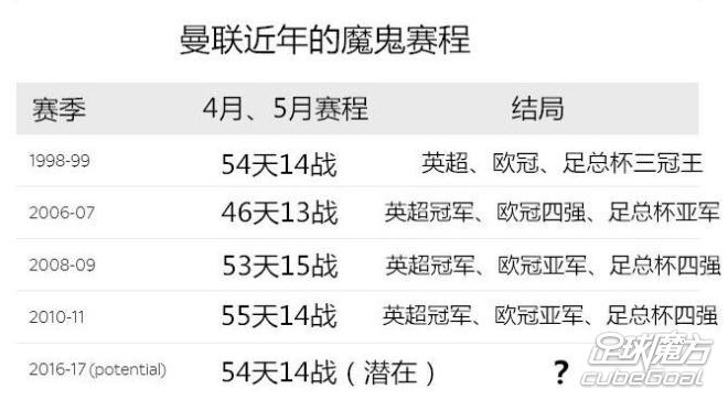 曼联将在4月份的30天内踢9场比赛。由于足总杯已经被淘汰,英超前四异常激烈,穆帅希望夺得欧联杯冠军成为双冠王,同时也就能拿到下赛季的欧冠资格。但是接下来的四月份来势汹汹。