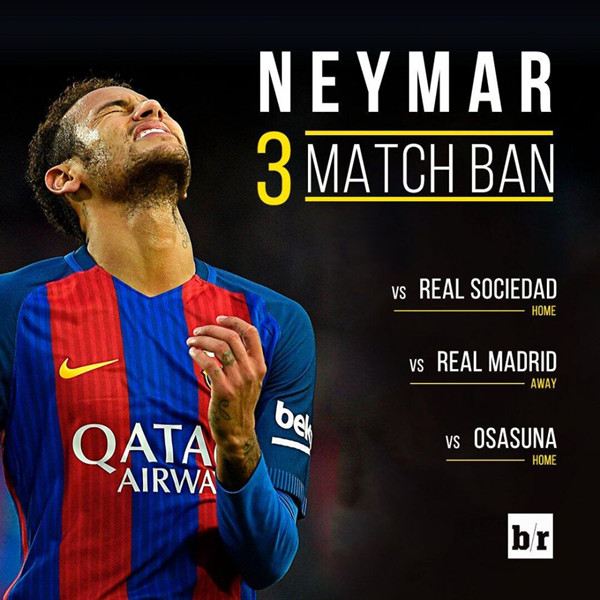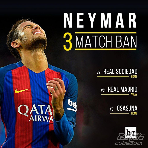 由于上轮比赛的红牌,内马尔将铁定无缘下轮对阵皇家社会的比赛。由于涉嫌向第四官员鼓掌,他遭到追加禁赛2场的处罚。
