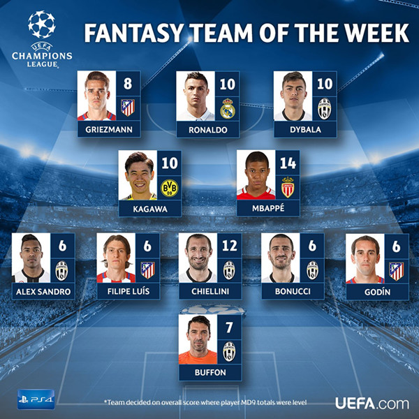 欧足联官方公布了本周欧冠最佳阵容,尤文图斯和马竞分别有五名和三名球员入选,其他三人为C罗、香川真司和姆巴佩。