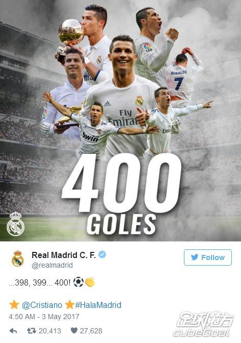 北京时间5月3日凌晨,欧冠半决赛首回合在伯纳乌球场上演,皇马凭借C罗的帽子戏法3-0大胜马德里竞技,在次回合较量前占得先机。皇马官方推特认定C罗的队史进球数达到400个。