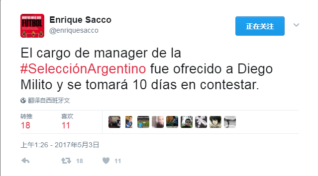 最后,国家队经理,足协已经向迭戈-米利托发出邀请,前国米前锋有10天的时间进行考虑。去年退役之后,米利托一直处于赋闲状态。