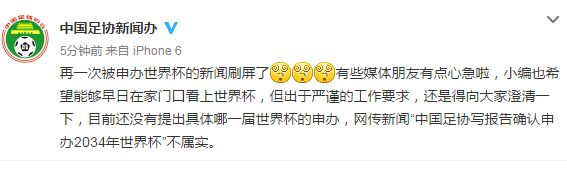 针对此前申办2034年世界杯的传闻,中国足协新闻办正式予以回应,官微对于表示申办世界杯的消息并不属实。
